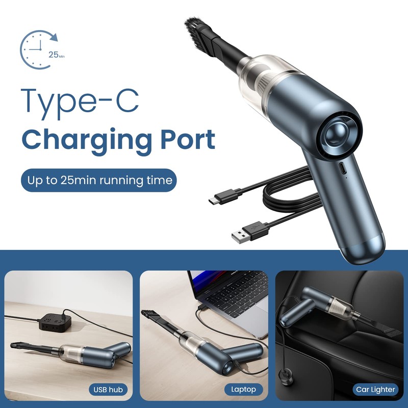 - 😍【TYPE-C FAST CHARGING& LONG USING TIME】😍The portable car vacuum utilizes the type-C charging port that adopt the fastest and high efficient USB charging technology which saves charging time than normal.And the mini vacuum cleaner ensures work up to 20 minutes after being fully charged.