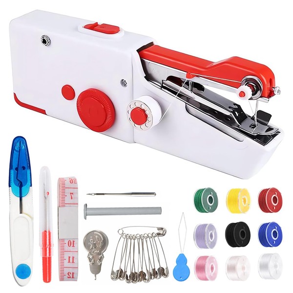- PRACTICAL SEWING TOOL WITH SEWING KITS - Hand held sewing machine comes with an user instruction, 9 x thread spools,1 scissors,10 safety pins,1 needle threader,1 sewing needles, 1 extension spindle and 1 measuring tape. A complete sewing set is very suitable for DIY beginners. It's a nice gift for your friends and family.