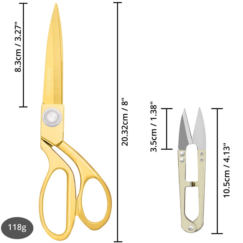 - Razor sharp professional cutting scissors: these gold-plated tailor's scissors are already oiled, so they are ready to use immediately. Blades can be ground for smooth and clean cutting for many years to come. Suitable for both right-handed and left-handed users. These scissors are 8 inches long overall and the blades measure 3.25 inches. The total weight of the scissors is 118 grams.