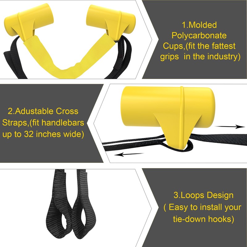 - Quality Construction: Two glass-filled injection Molded Polycarbonate Cups, which are sized to fit the fattest grips in the industry. Adjustable Cross Straps and Loops Design, Easy to install your motorcycle hooks. The Handlebars Strap refine the process of securing and trailering your bike to the highest level. Using our motorcycle handlebar straps is the safest way to stapping your bikes down and is easily adjusted