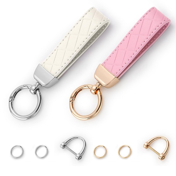 Handlive 2 Pack Leather Keychains, Car Key chains for women men, Key Fob Holder with Keyrings, Anti-Lost D-Ring (White Silver and Pink Gold)