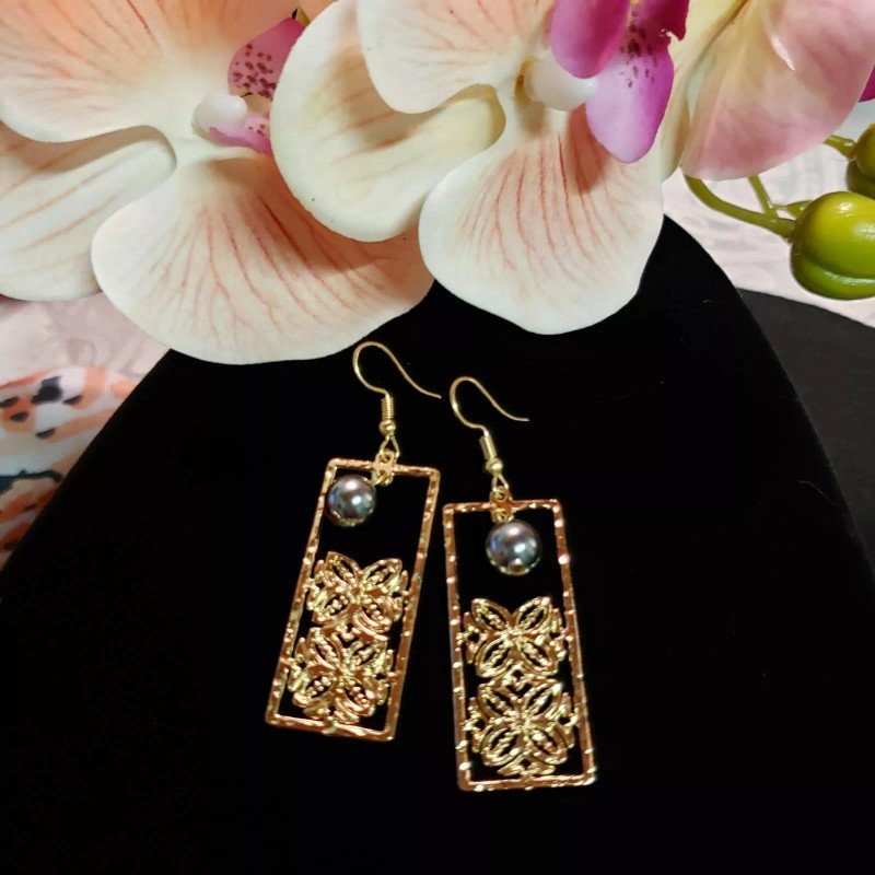Handmade 14kt GP Quilted flower Pearl Dangle Earrings, Dangle earrings, FREE SHIP