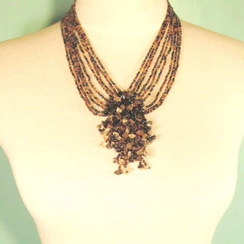 "Handmade" 16" Gold Black Multicolor Gemstone Chip Cluster Handmade Seed Bead Bali Necklace