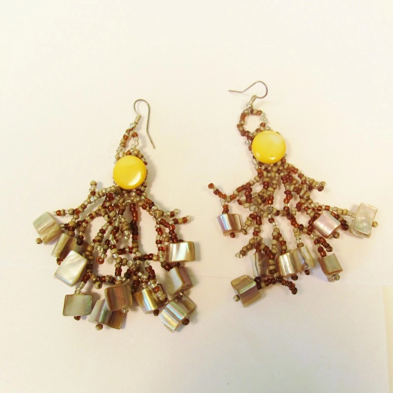 Handmade 3" Yellow Gold Color Bohemian Shell Chips Handmade Dangle Seed Bead Earring