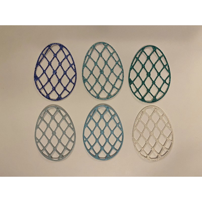 This is a mix of blue, turquoise/teal, and white iridescent eggs die cut from glitter and shimmer cardstock. Please note that the glitter is only on one side of the cardstock. The shimmer is subtle (see photos)