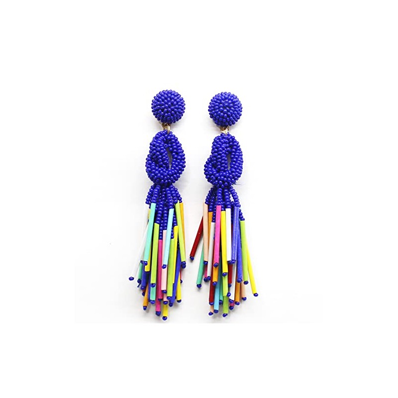 Handmade Beaded Solid Color Post Statement Earrings for Women All Season 4 inch Long (Blue Multi)