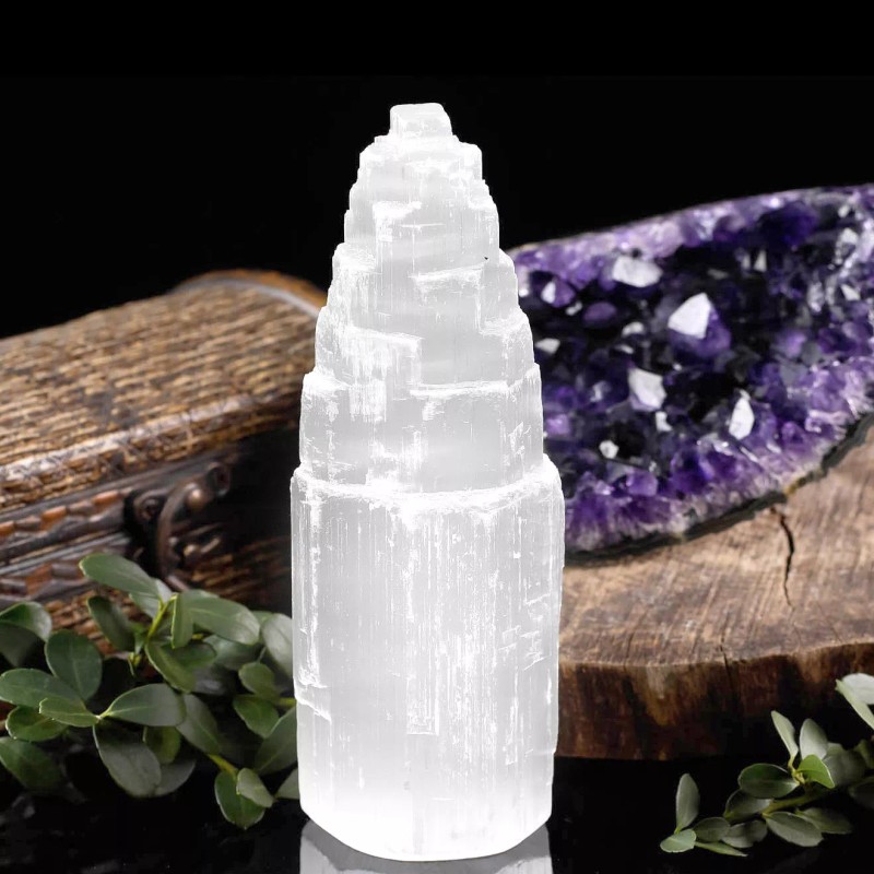 Handmade by mmCrystals Natural Selenite Tower Crystal Energy Point " Cleanse Reiki Healing Protection