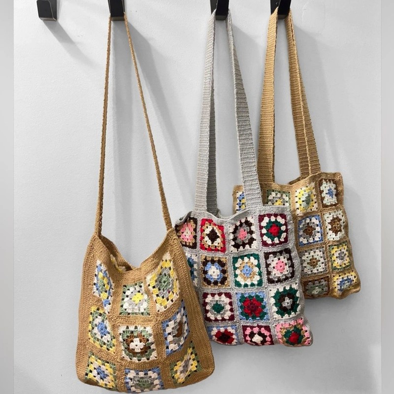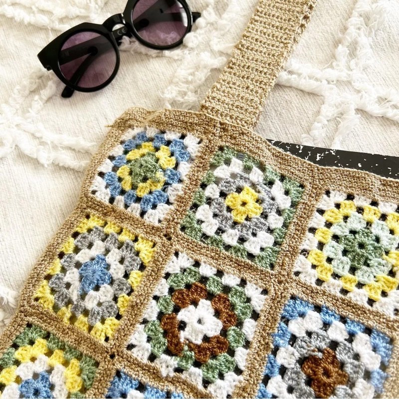 Handmade Crochet Granny Square Mini Tote Bag Beige, Tan Y2K book bag multicolor