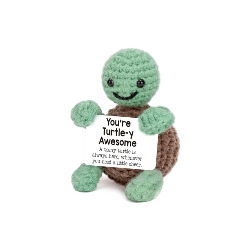 Bring a smile to someone special with this adorable handmade crochet turtle plush toy! Standing at 10 centimetres tall, this charming little companion features a mint green body with a cosy brown shell, creating an irresistibly cute appearance. The turtle comes holding a heartwarming message card that reads 'You're Turtle-y Awesome', along with a sweet reminder that this teeny turtle is always there when you need a little cheer. Crafted with soft yarn and detailed with adorable black button eyes and a friendly embroidered smile, this plush makes a perfect desk companion, mood lifter, or thoughtful gift for friends and loved ones. The delicate crochet work showcases beautiful texture and attention to detail, making each turtle uniquely special. This endearing plush toy combines comfort and encouragement in one delightful package.