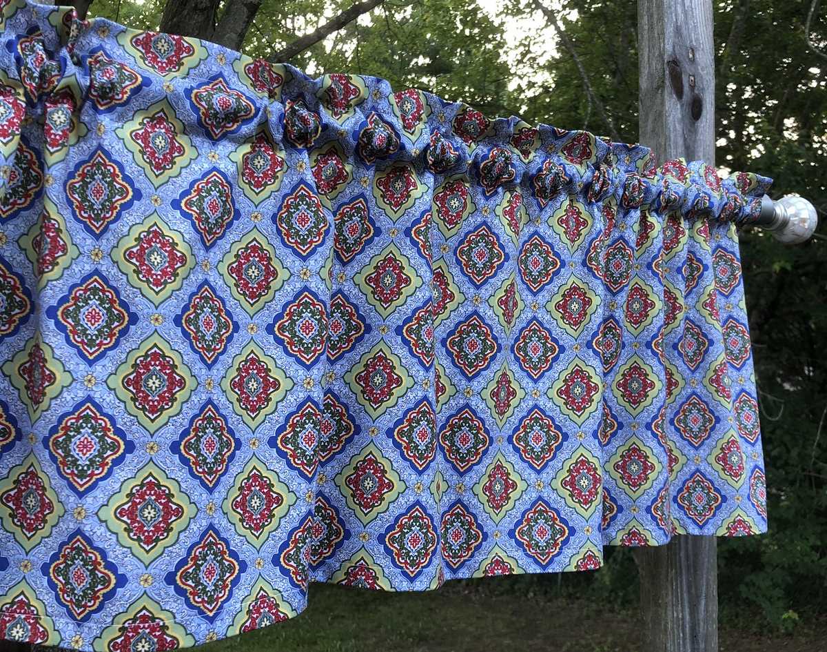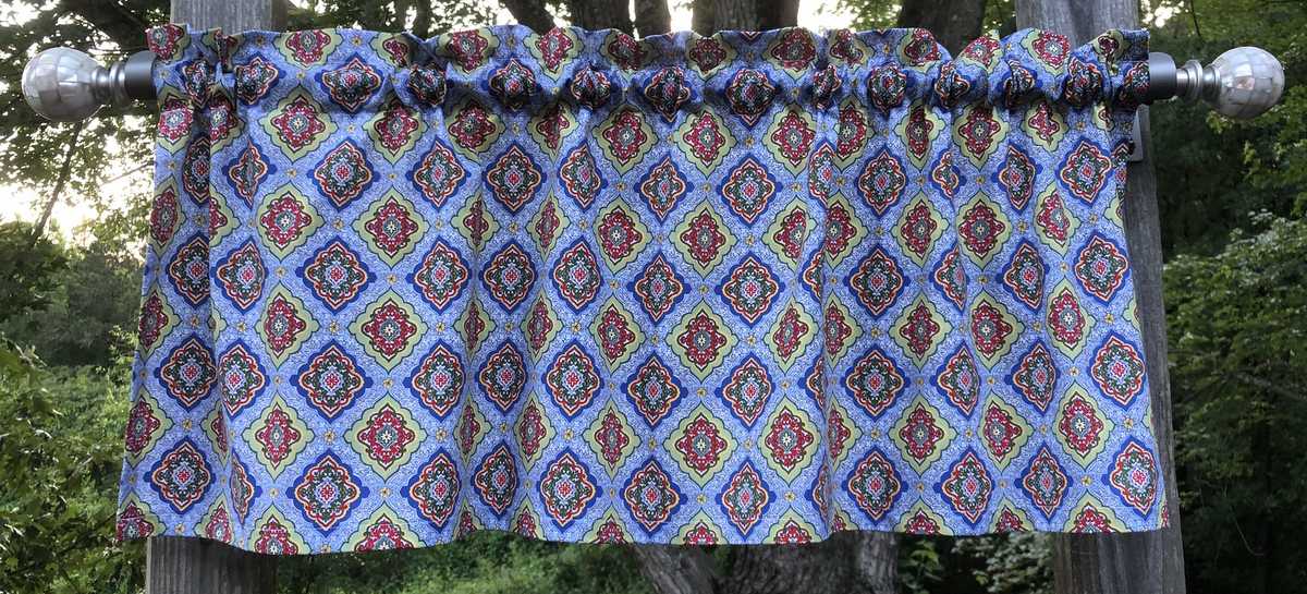 Diamond Floral Blue Valance Red Yellow Green Country Folk RV Camper Kitchen Farmhouse Window Curtain Topper