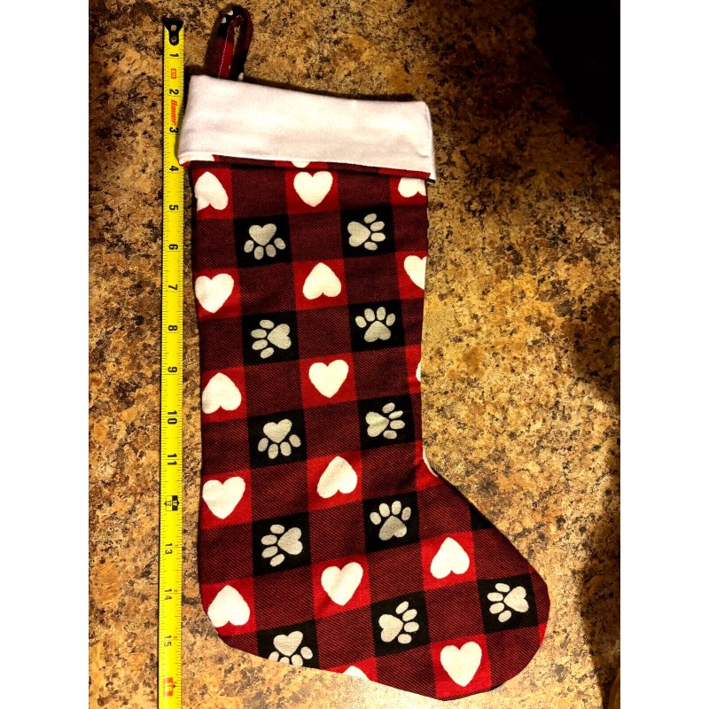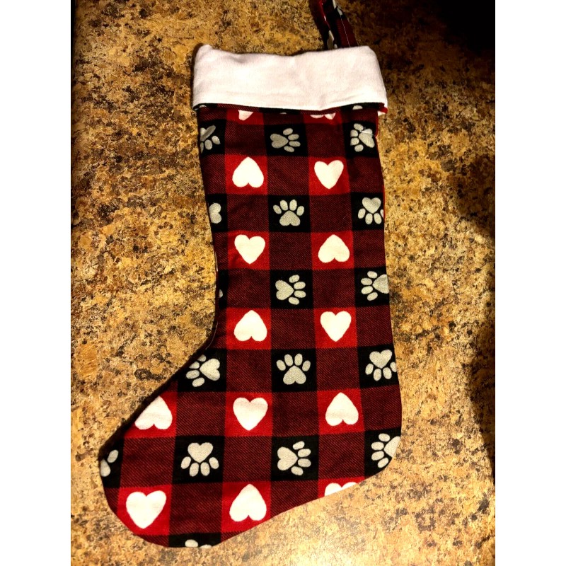 Handmade DOG PAW/HEARTS RED FLANNEL PRINT CHRISTMAS STOCKING HANDMADE-WHITE LINING