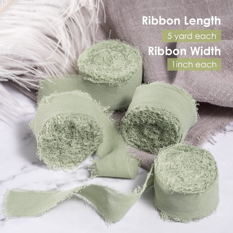 Handmade Fringe Chiffon Ribbon, 4 Rolls 1 Inch Green Ribbon Set, 60 Yards Chiffon Silk Ribbon for Wedding Invitations, Bridal Bouquets, Gift Wrapping, DIY