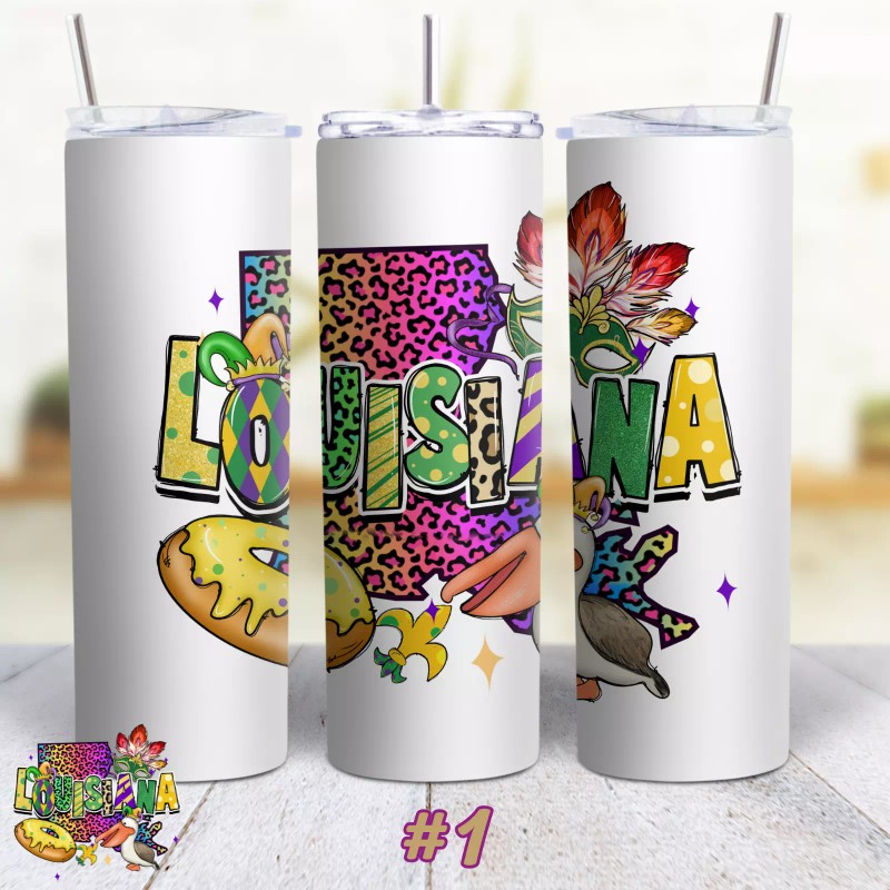 Enjoy your drinks in style with the 20 oz Sublimation Tumbler Mardi Gras!