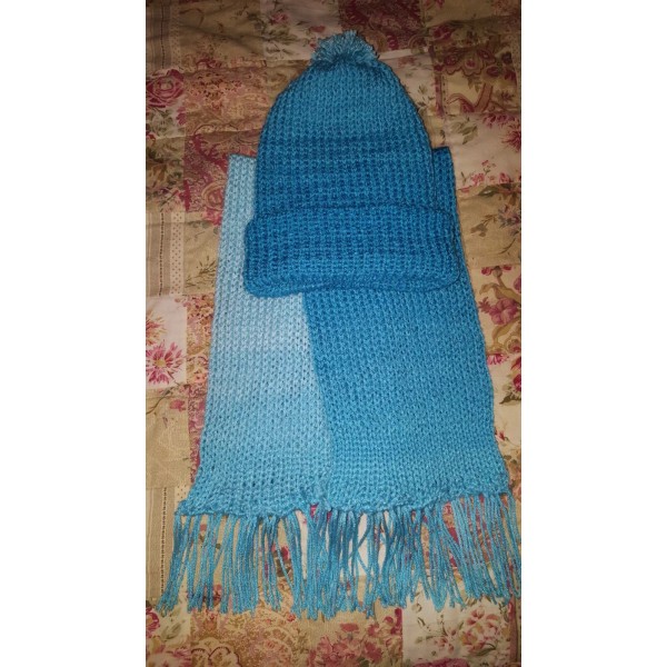 Handmade New Hand/Home made Knitted hat and scarf set in blue. one size.Unisex Very warm