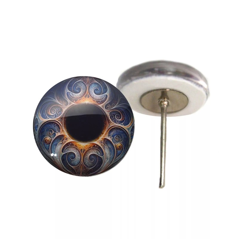 They are colored with denim blue hues with glisten gold details and black centers. They are made with high quality, handmade glass eye cabochons, attached to silver toned wire pin posts.