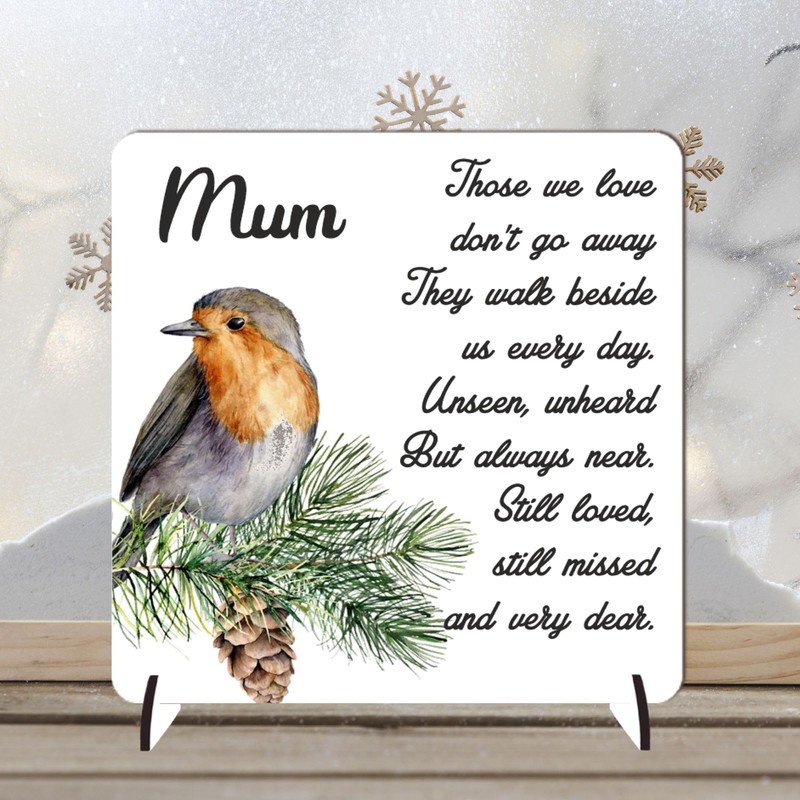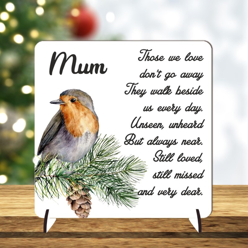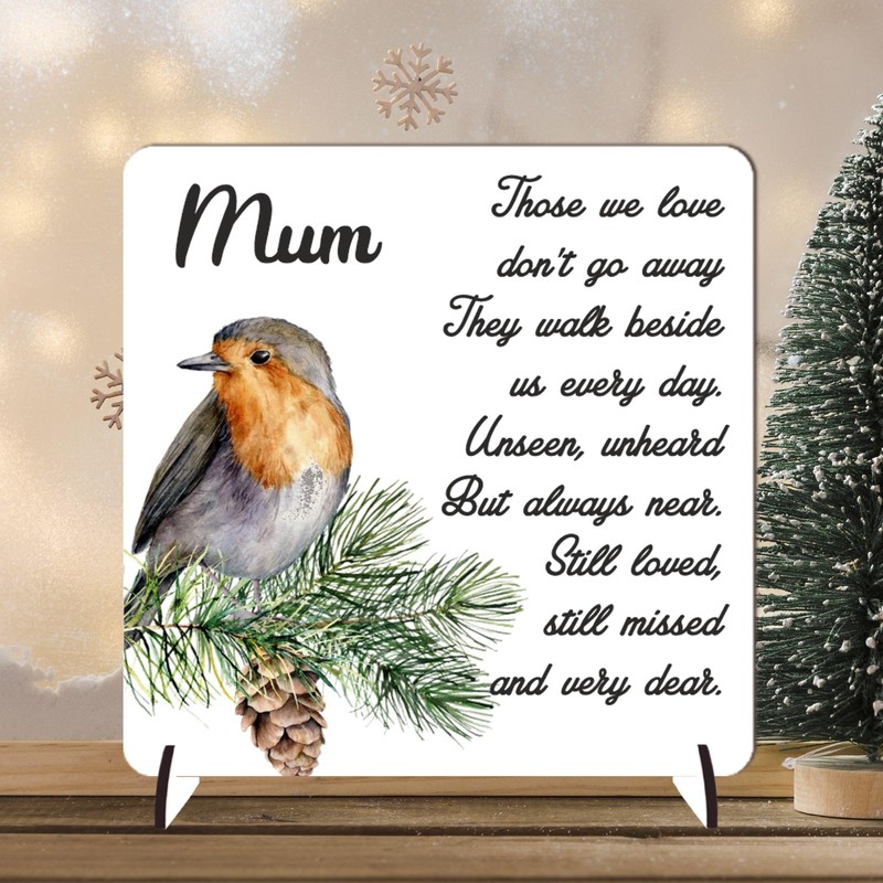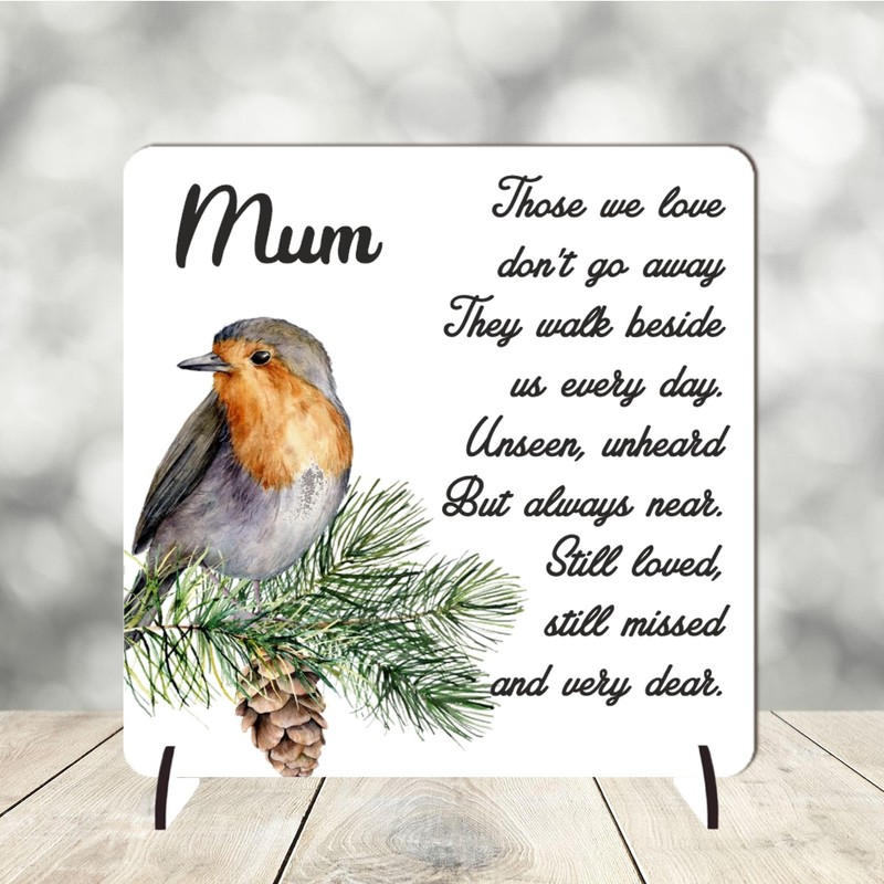 Handmade Personalised Memorial Plaque for Mum – "Those We Love Don't Go Away" – Custom Tribute with Robin Design Thoughtful Sympathy and Bereavement Gift (Mdf Wood Indoor Use Only)