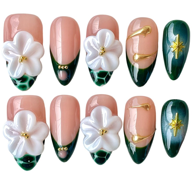 - DESIGN FEATURES: Medium almond-shaped nails featuring elegant 3D white floral embellishments, emerald green tips, and intricate snake scale print pattern.