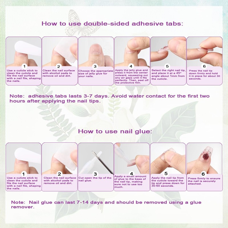 • Wear Duration: If you want to keep your nails lasting for over 14 days, we recommend using nail glue. Please note: after using nail glue, it's recommended to use a nail remover or follow salon removal procedures for safe removal.
