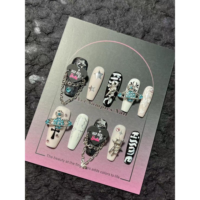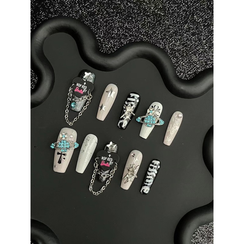Handmade Press on Nails Long MouyouGlow, Ballerina Black Letter 3D Planet Star Cross Cool Y2K Coquette Spice Girls Resuable Fake Nails, Handmade Artificial Fingernails, 10 Pieces (75-M Size)