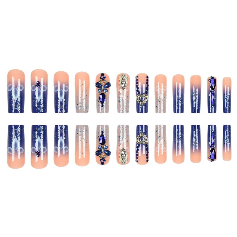 Handmade Press on Nails Long Square Fake Nails with 3D Rhinestones Butterfly Heart Designs Gradient Nails Press ons Blue Acrylic Nails Glossy Glue on Nails Glitter Stick on Nails for Women 24Pcs