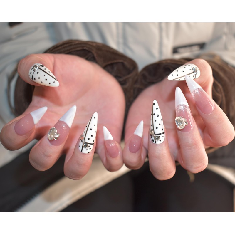 Handmade Press On Nails Long White French Tip with Diamond Spot Cream Design, Set of 10 Pcs Acrylic Press On False Nails Stiletto, Size Medium