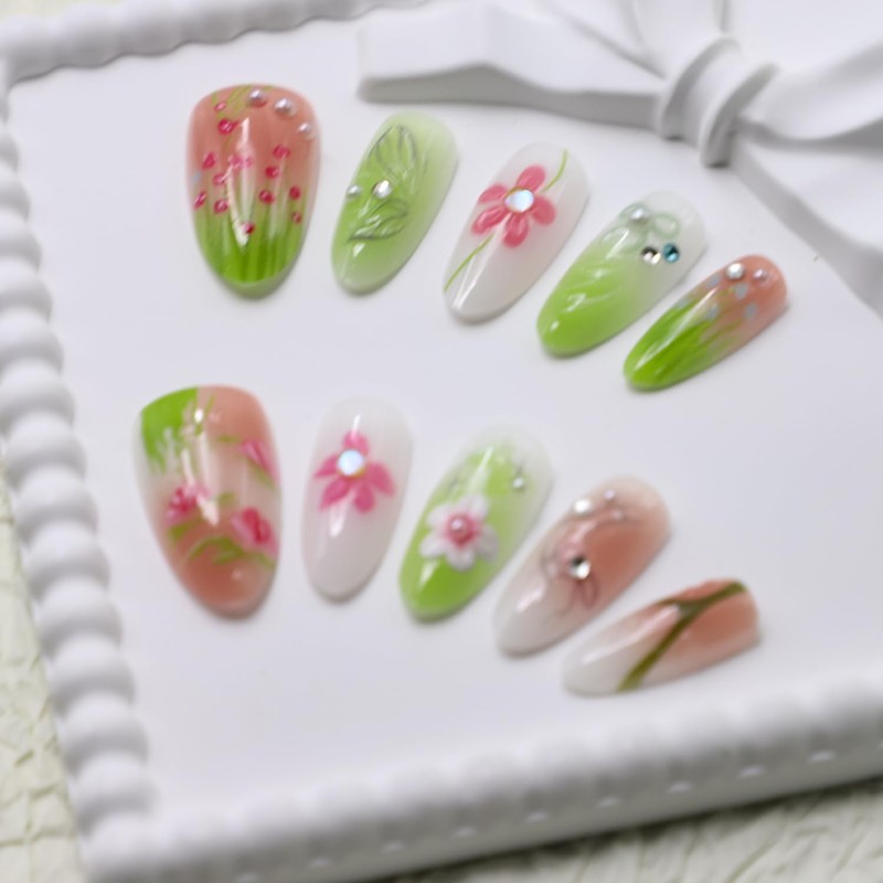 Handmade Press on Nails Medium Almond Nails Flower Fake Nails,3D Lines Designs False Nails Summer Reusable Acrylic Nails Nature Glue on Nail for Wome (Size M)