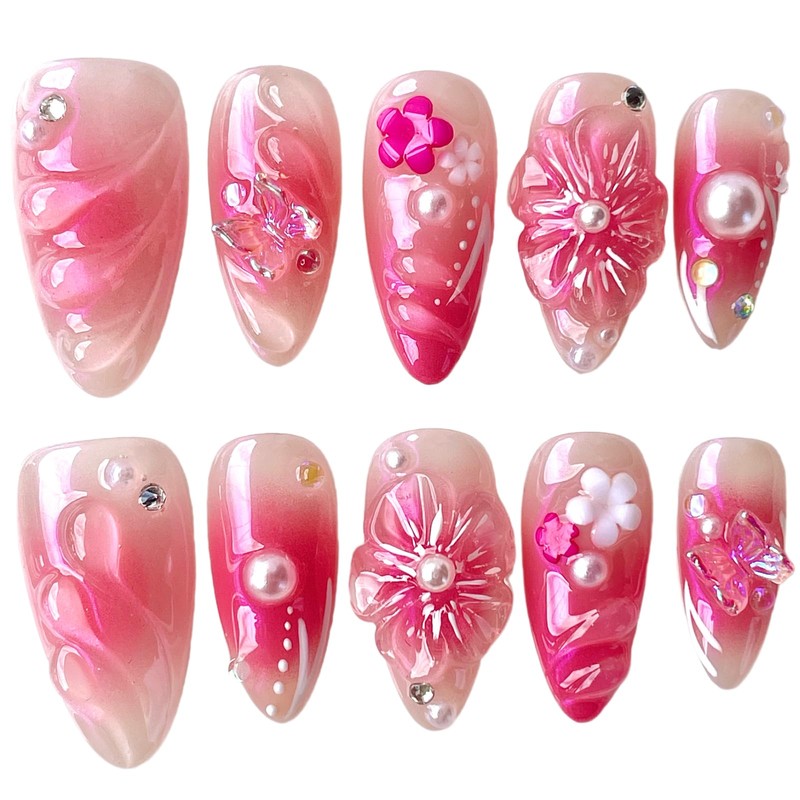- DESIGN FEATURES: Medium almond-shaped press-on nails featuring an elegant pink aurora cotton candy gradient with intricate 3D floral designs and decorative butterfly accents.