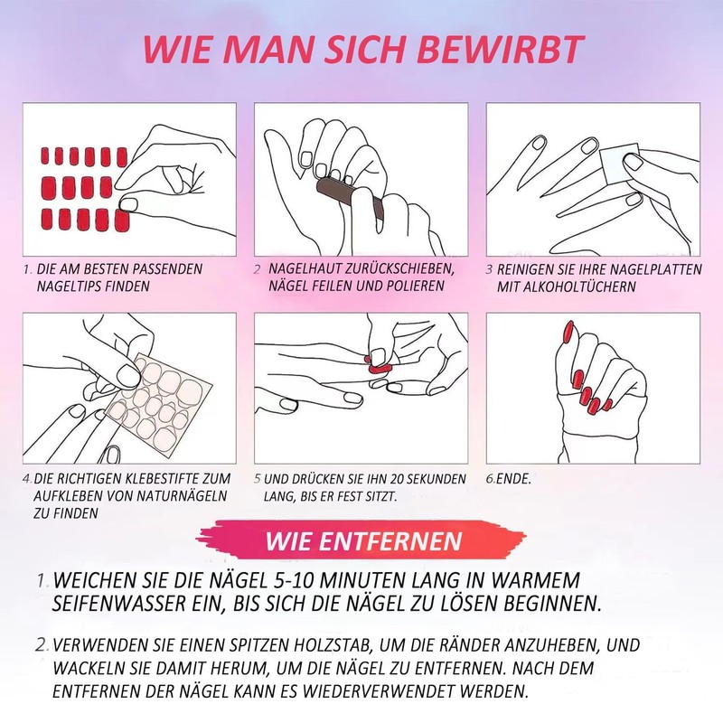 - Package includes: 10 pieces handmade press on nails + 1 piece acrylic box + 1 piece wooden sticks + 24 pieces adhesive pads (no liquid glue included) + 1 piece nail file