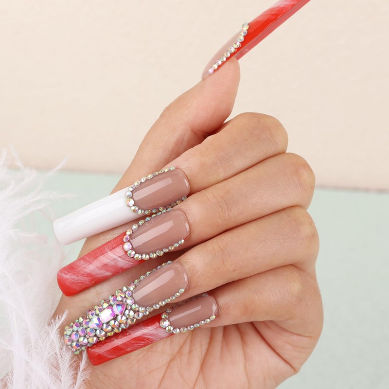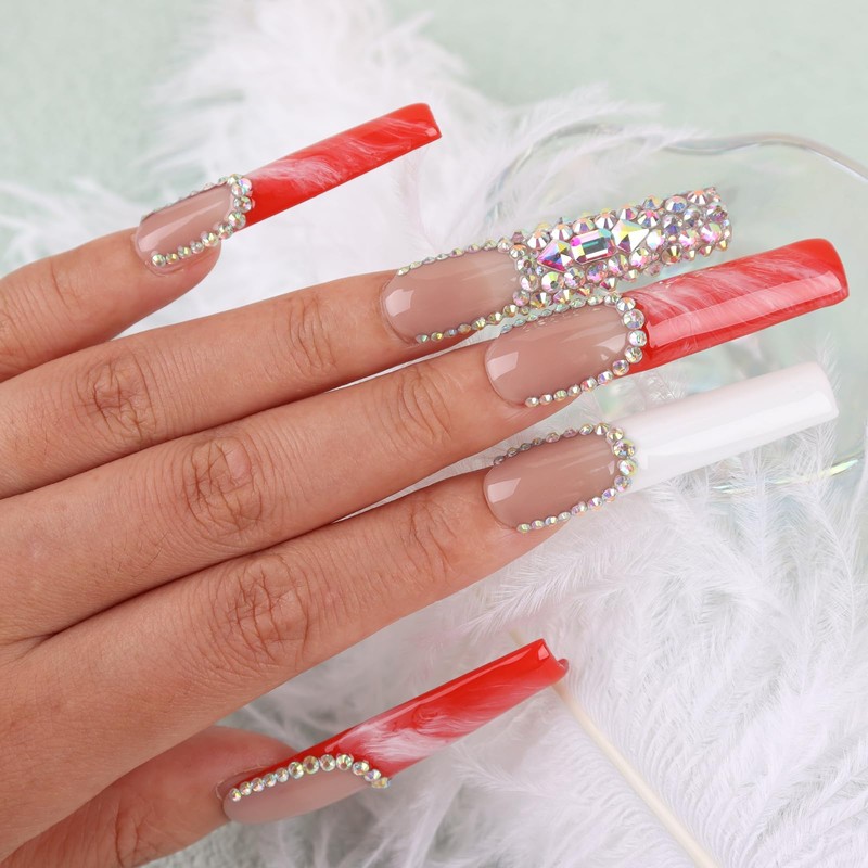 Handmade Press on Nails Power,Red & White Nails with Crystals, Extra Long False Nails, Reusable Stick On Nails 10Pcs,Size M
