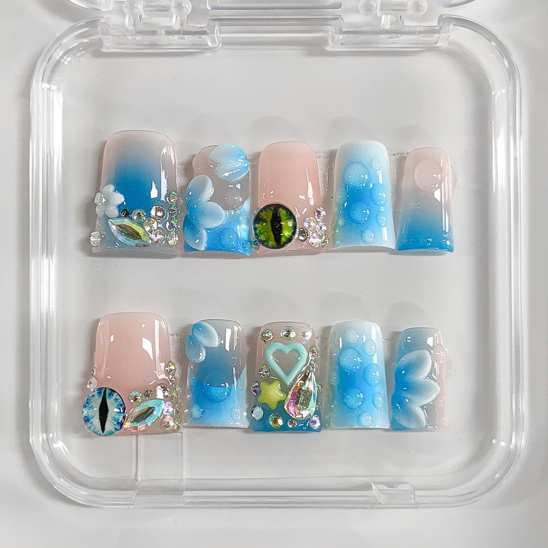 Handmade Press on Nails Short Duck 3D Floral Thick Acrylic Fake Nails French Tip False Nails with Rhinestones Flower Eyes Charms Designs Nail Blue Sturdy Art Press on Nail 10Pcs(M)