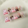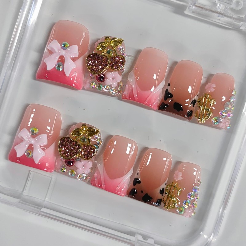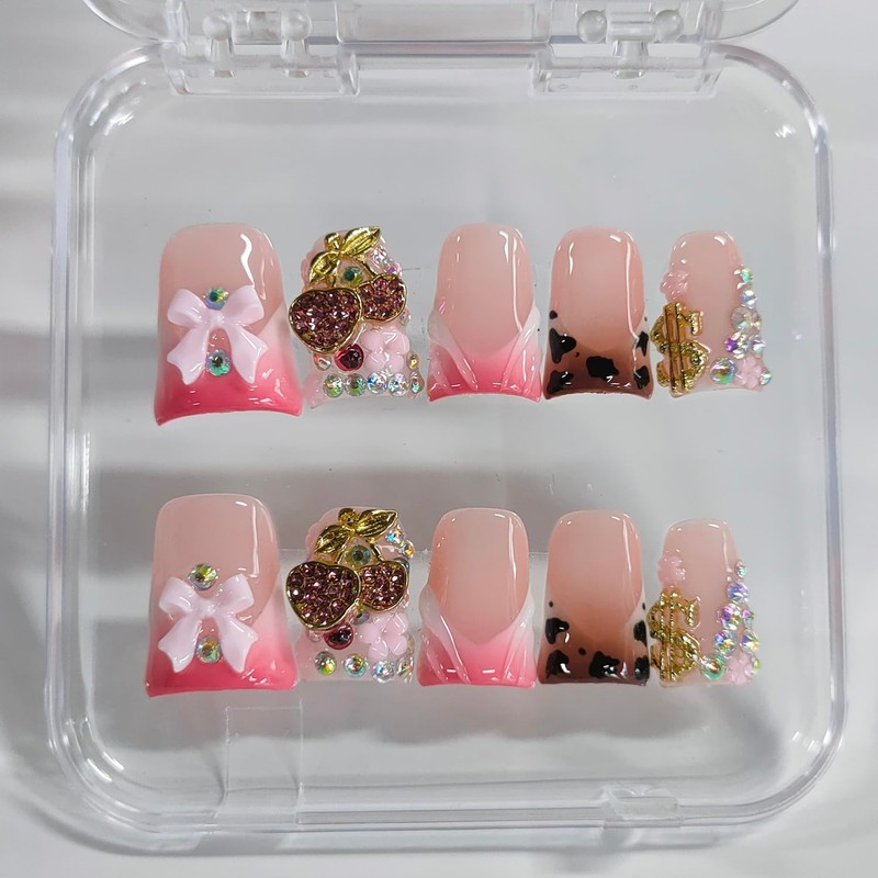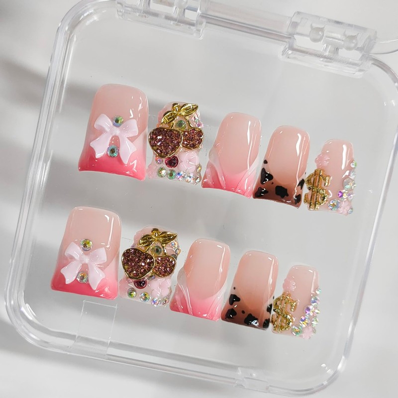 Handmade Press on Nails Short Duck 3D Pink Thick Acrylic Fake Nails French Tip False Nails with Leopard Print Rhinestones Bow Cherry Designs Autumn Sturdy Nail Art Press on Nails 10Pcs(S)