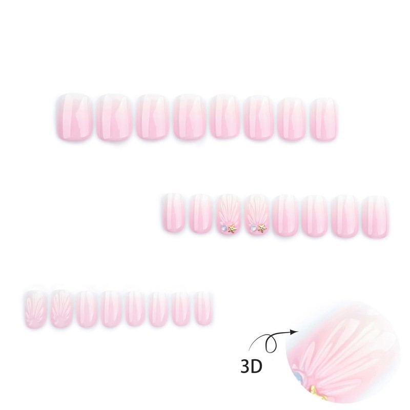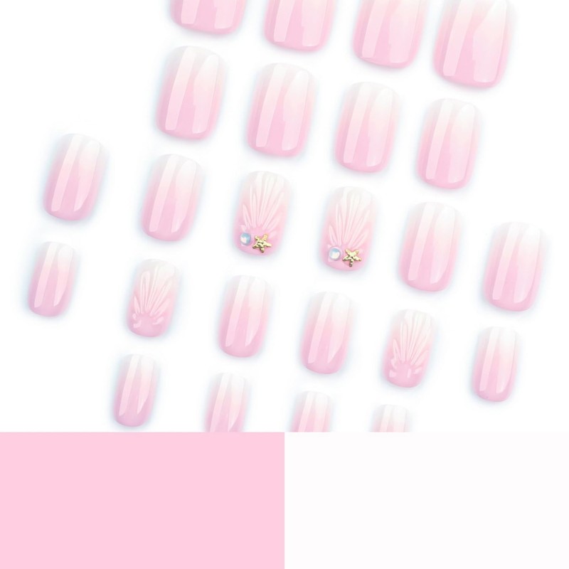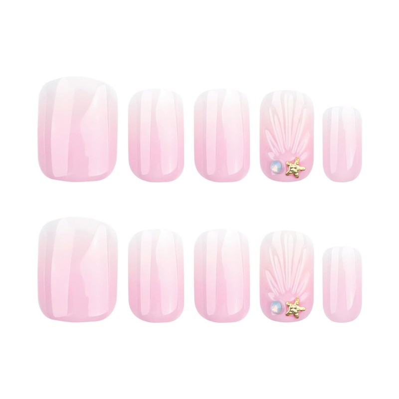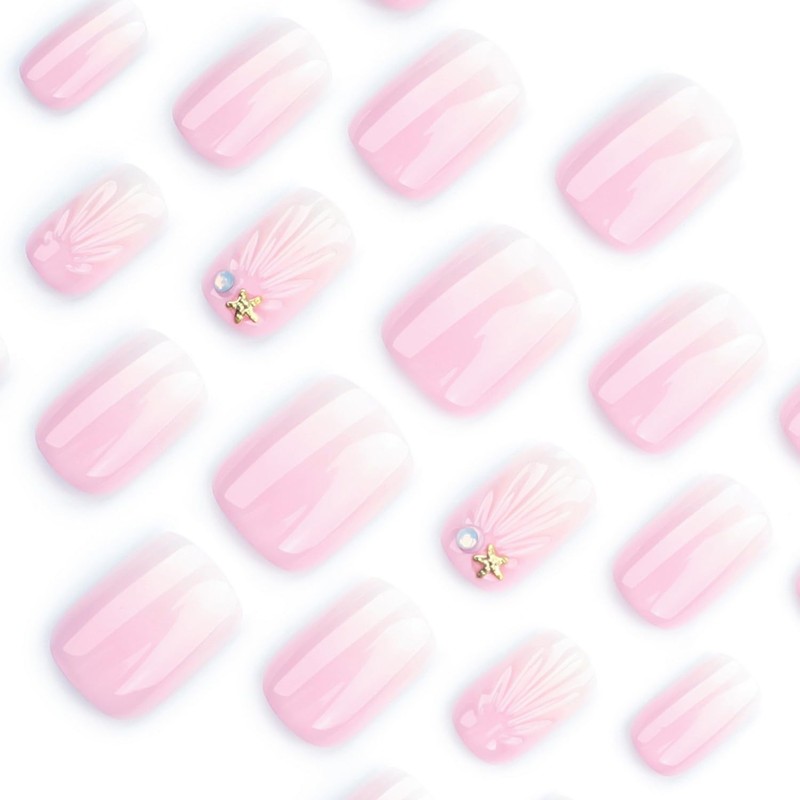 Handmade Press on Nails Short Square MABKJLF Ombre Fake Nails Pink White 3D False Nails with Designs Starfish Pearls Shell Full Cover Glossy Glue on Nails Summer Stick on Nails for Women Girls 24 Pcs