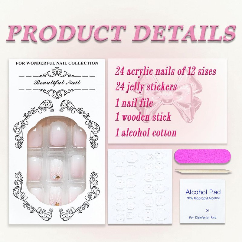Package Contents: 24pcs false nails,24pcs Jelly glue, 1pc wood stick, 1pc mini nail file, 1pc alcohol pads.