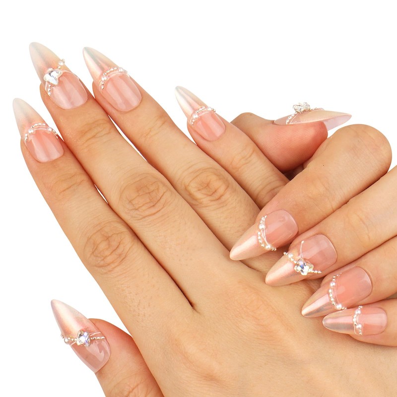 Handmade Press on Nails with Glue Handcraft Shimmery Pink Tips with Pearl Edging & 3D Crystal Butterfly, Medium Almond Shape 10pcs (Butterfly Whisper - M)
