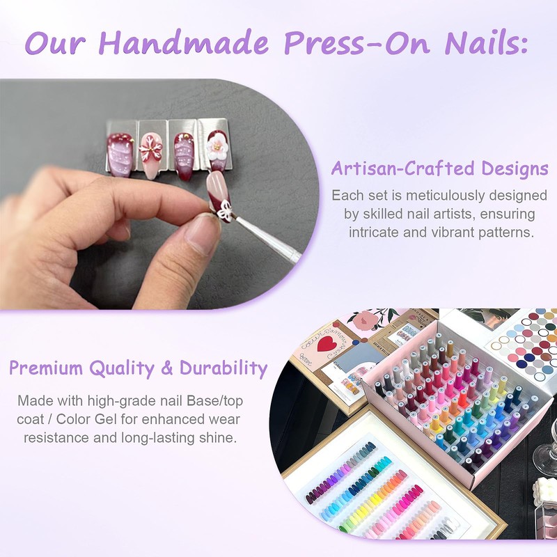 - 1. Premium Handcrafted Press-On Nails - Each nail features exclusive hand-painted designs, engravings, or delicate 3D embellishments for a luxurious, salon-quality look. The flattering Almond shape ensures all-day comfort that it's nice for effortless or glamorous wear.