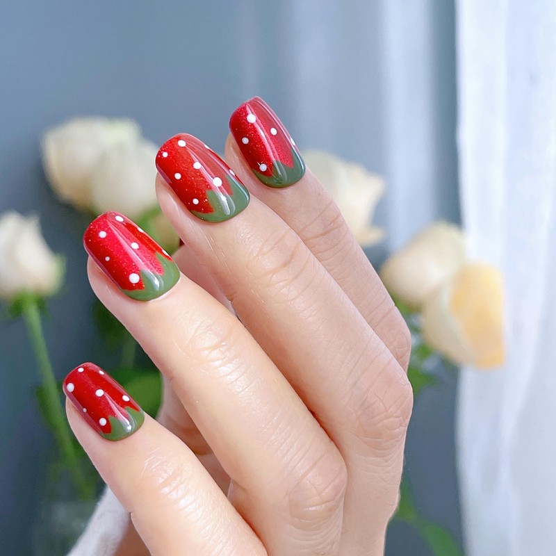 Handmade Press-On Nails with Hand-Painted Strawberry Design in Short Square Shape, Reusable Hand-Painted Nails, Including Tool Kit, 10 Pieces (SHN017-M, Medium)