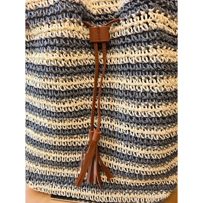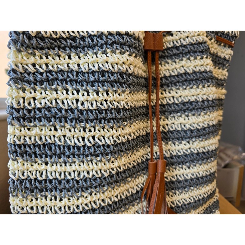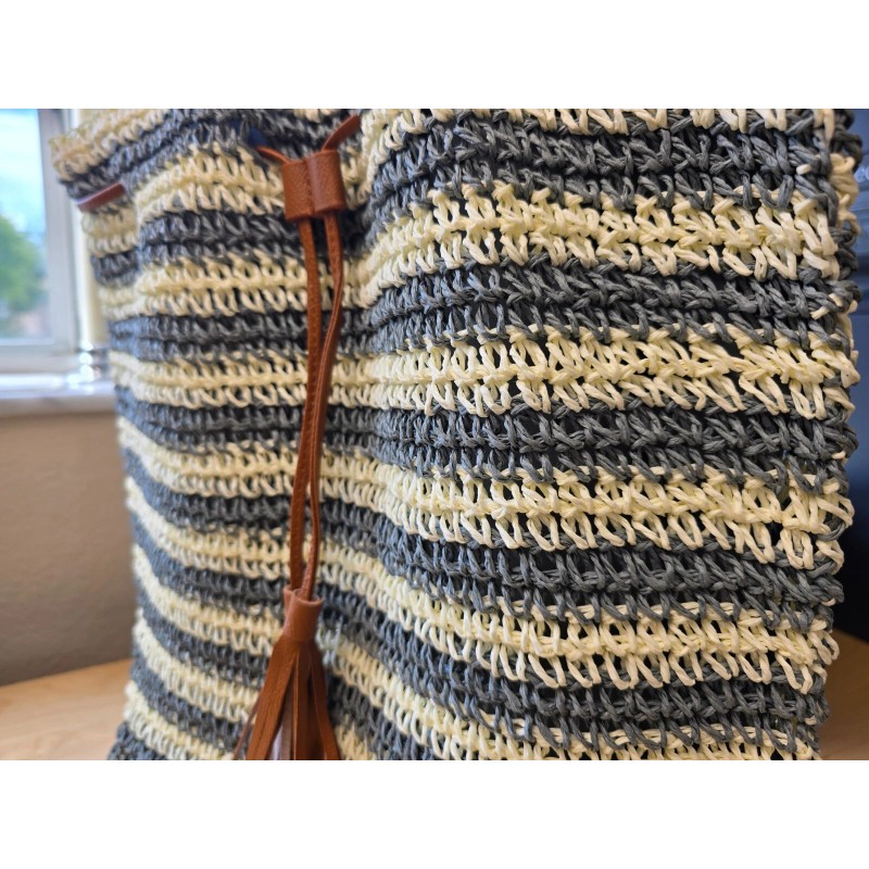 Beautiful lightweight HANDMADE raffia woven / crochet shoulder tote bag, perfect for the beach and everyday use. Comes in cute stripes of Ivory and Gray with brown straps and drawstrings. Lays flat, foldable, lightweight, and roomy...great for traveling! Lined and has 2 inside pockets.
