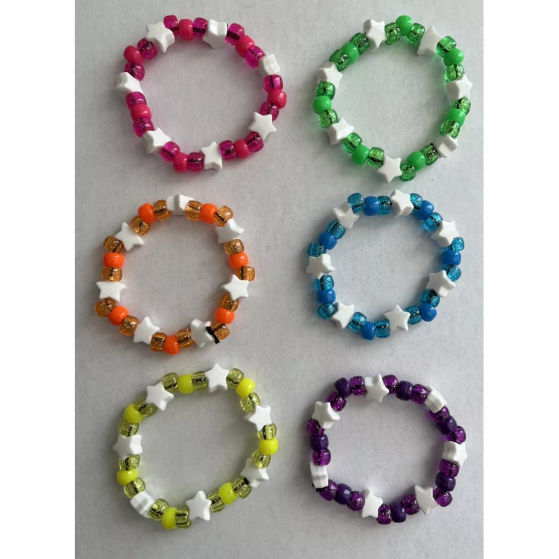 This pack of 6 Kandi Bracelets has every color of the rainbow! These are the perfect accessory for any festival!