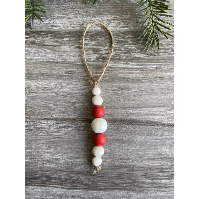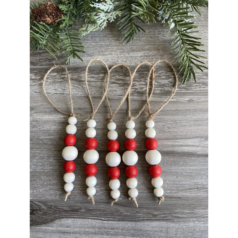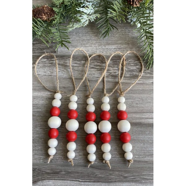 Handmade Set of 5 Natural & Red Wood Bead Christmas Ornaments Decor