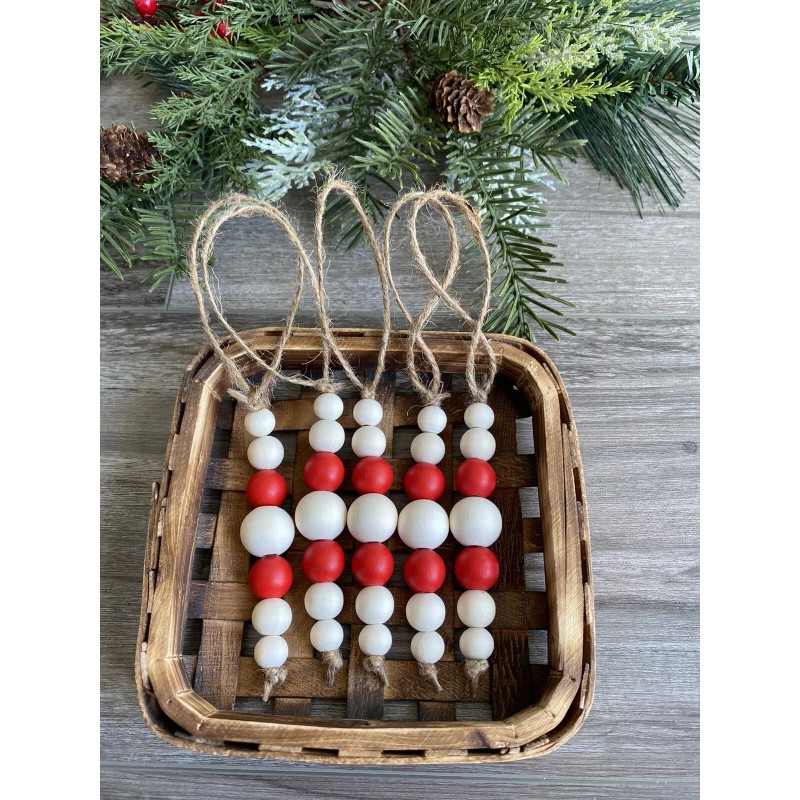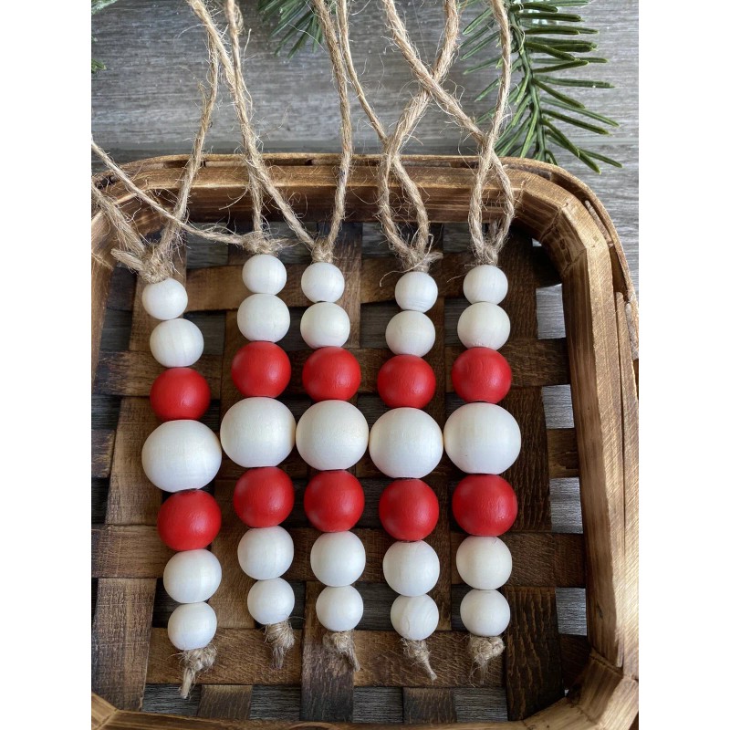 This is for a set of 5 handmade wooden bead Christmas ornaments. These are made with different sizes of wooden beads that are natural and red, the largest in the middle is 20mm. These are about 4” long, not including the twine hanger. These would be great on a tree, hanging on other decor such as a vase or lantern and would also make a cute package topper. No other decor items are included in this listing. Pictures just give a couple of examples on how these could be used. Shipped with USPS First Class Package. Check out my other items. I do combine shipping. First item is full price shipping. Each additional item is .50 additional shipping, with a maximum of $5.00 shipping for all items paid for in the same order! Any questions please ask. Thanks for looking!