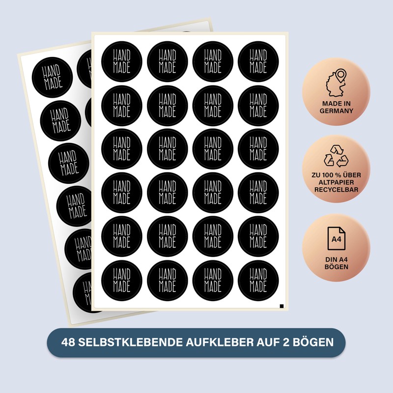 • Handmade with love: you will receive two handy DIN A4 sheets with 48 stickers. The round stickers have a diameter of 4 cm. We print the lettering on self-adhesive recycled adhesive paper with high-quality, textile effect.
