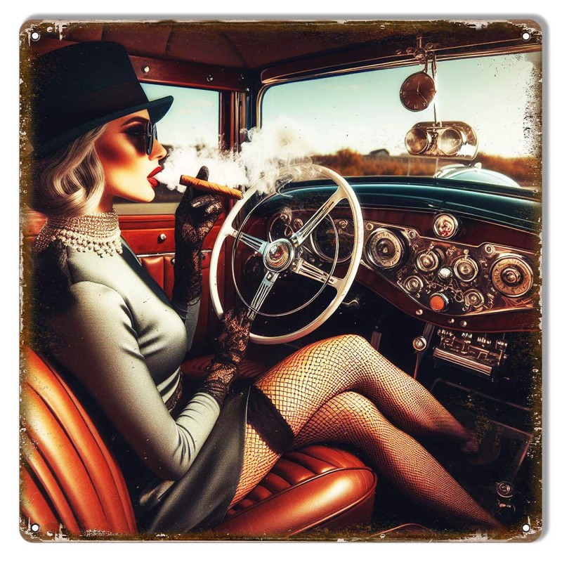Handmade Woman With Cigar in Car 12x12 Metal Sign
