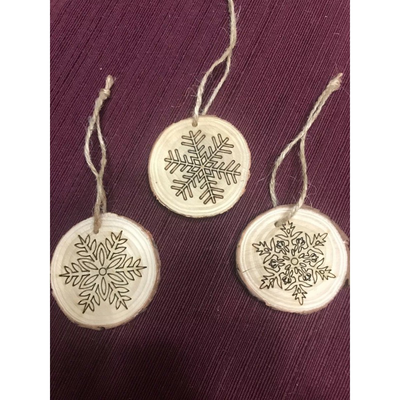 Wood burned Christmas ornaments.  You will get one of each of the ornaments shown in the picture.  Each piece of wood measures approximately 2.4 inches across, and still has the outside bark layer around the edges.  They will each come with a piece of twine to hang it with.  These also work great in place of bows on presents!  These are one of a kind ornaments so get them while they last!!