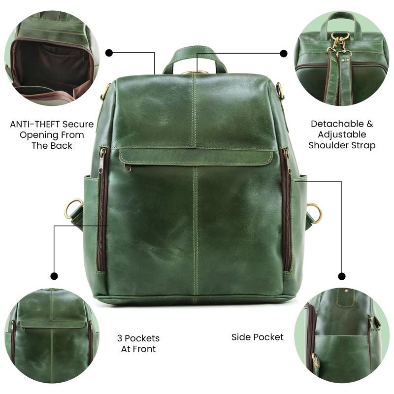 Handmade World Leather Backpack Convertible to Purse 'The Honeycomb' Shoulder Bag Travel Versatile Rucksack Daypack (Green)