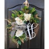 A decorative 12" white script monogram and beautiful pin stripe ribbon bow makes this wreath one of a kind.