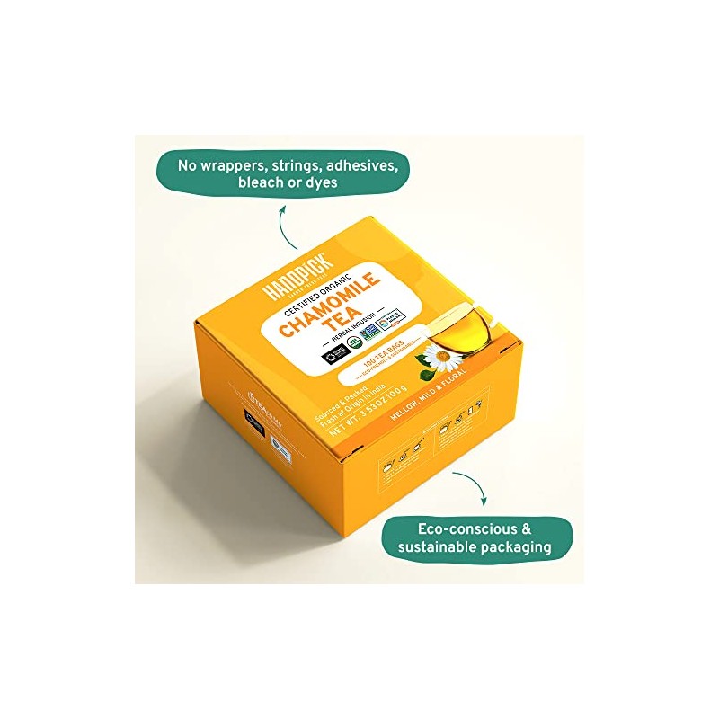 HANDPICK, Organic Chamomile Tea Bags (100 Count) Caffeine Free, USDA Organic, Gluten Free | Chamomile Herbal Tea in Eco-Conscious Tea Bags | Floral Tea