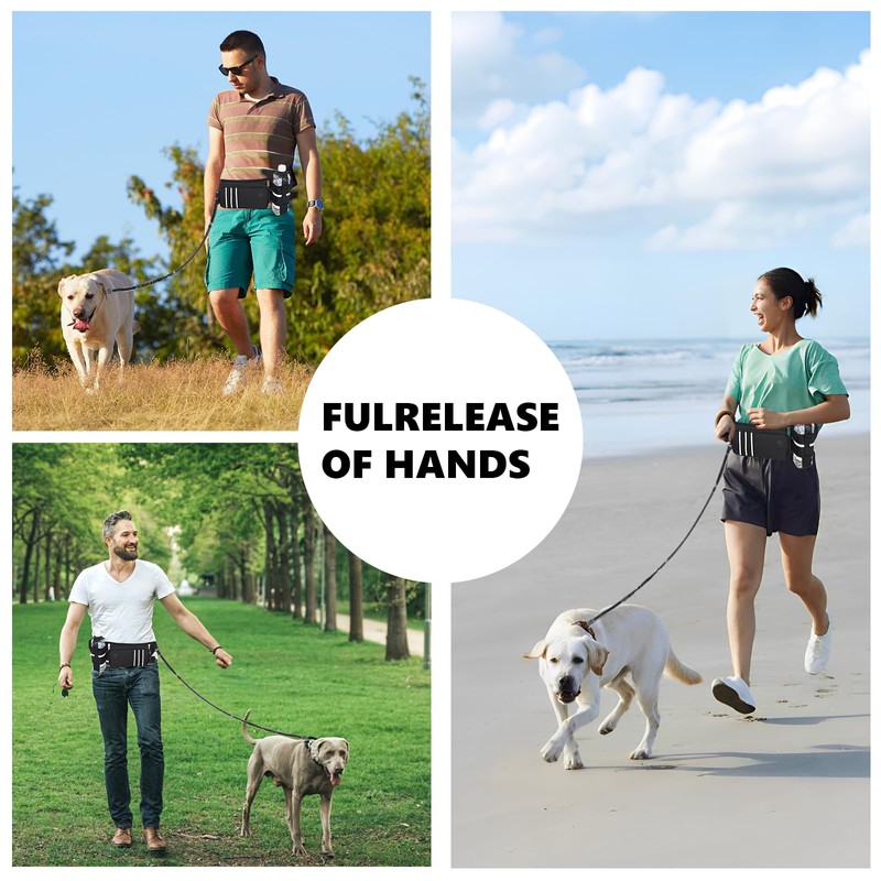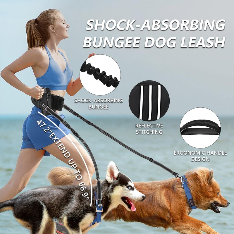 Hands Free Dog Leash for Medium Dogs - Adjustable Running Waist Belt with Poop Bag Dispenser & Pouch and Water Bottleholder, Reflective Bungee Leash Dual Handles for Large Small Dogs