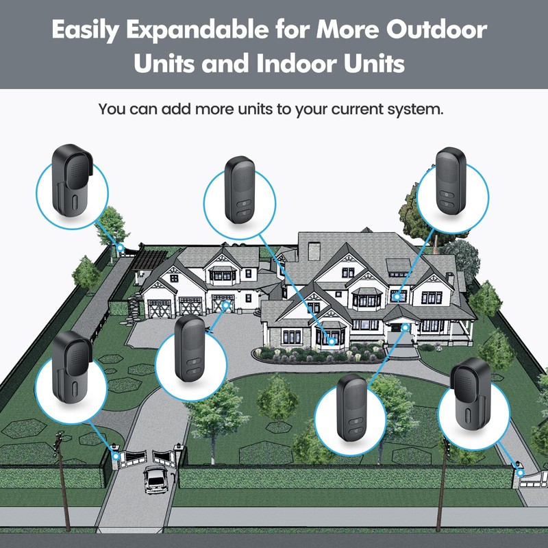 - [Long Range & Expandable] This wireless doorbell chime transmits up to 1/2 Mile in an open area! The wireless intercom doorbell is expandable up to 2 outdoor units and 5 indoor units. All doorbell sets are paired in the factory; you do not need to pair units if you buy the set. Just charge it and use it.
