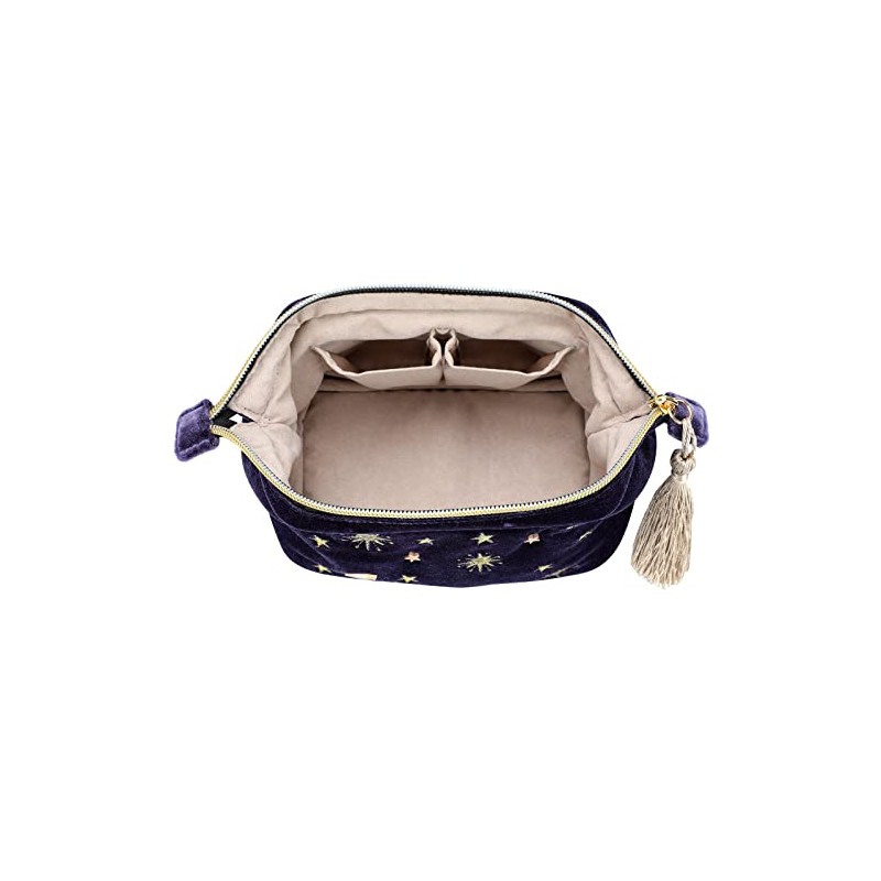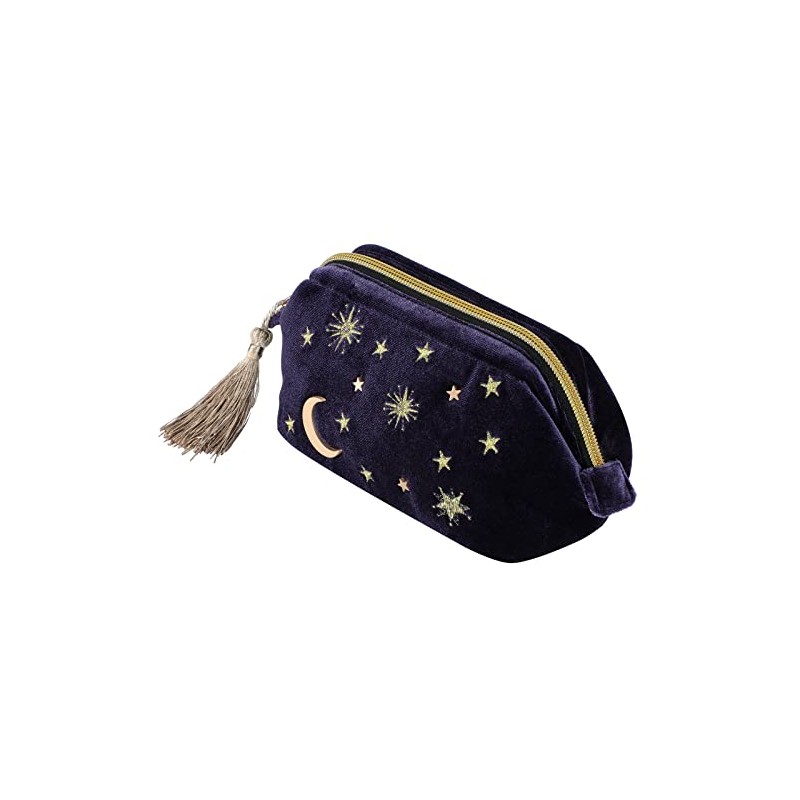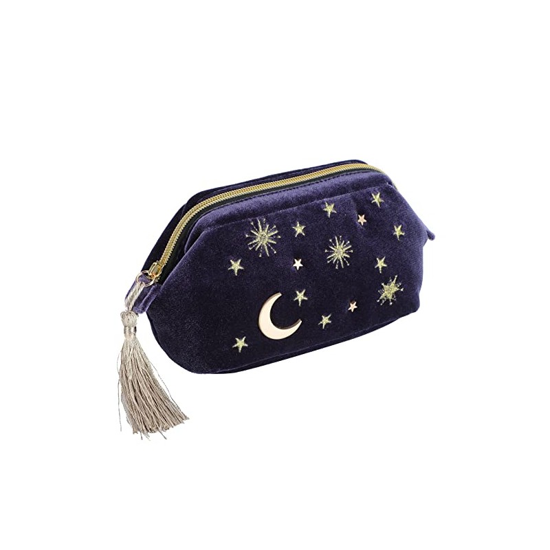 Handy cosmetic makeup bag,Navy Velvet Embroidered Applique Moon Stars Sun Cosmetic Bag,Starry Makeup Pouch with Tassels & Pearl Zipper,Beautician Storage Bag Clutch Handbags,Toiletry Wash Bag