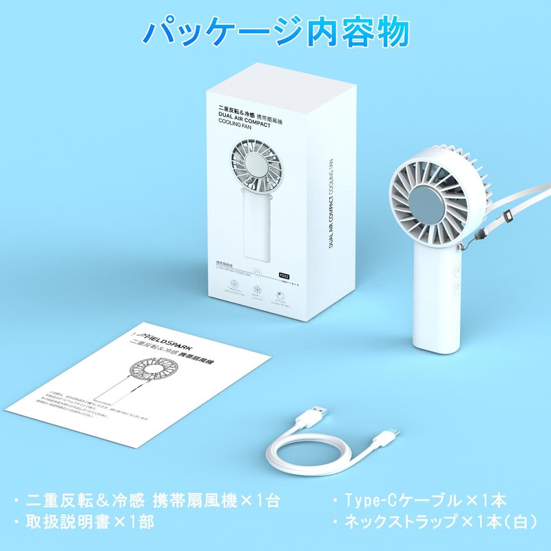 - Product Specifications: Product Name: Double inverted & cooling portable fan; Brand: FieldSpark ● Size: Approx. 6.9 x 3.1 x 1.8 inches (17.6 x 8.0 x 4.5 cm); Weight: Approx. 7.1 oz (206 g); Number of Blades: 5 x 2; DC motors: 2; Package Contents: Mobile fan x 1, Type-C cable x 1, instruction manual (English language not guaranteed). x 1. Battery Capacity: 3,000 mAh